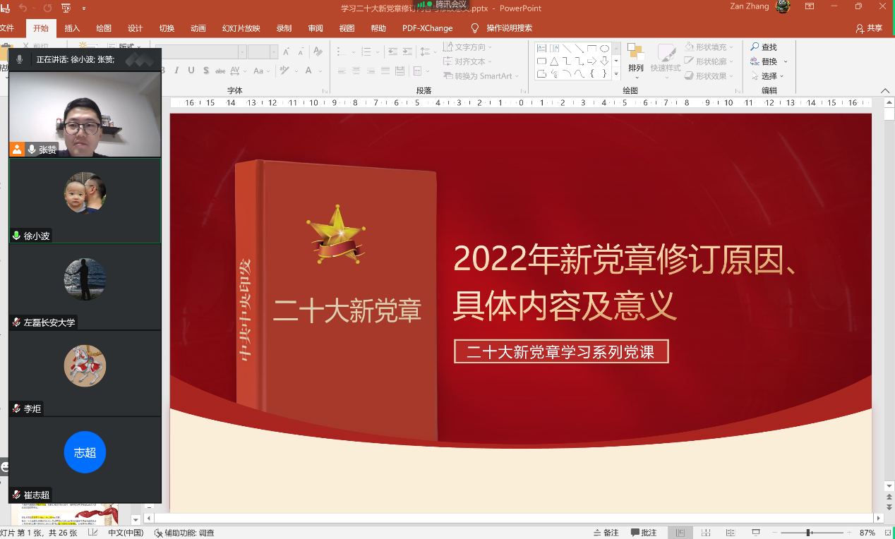 接下来,张赞带领大家学习了解了2022年新党章修订原因、具体内容及意义。《中国共产党章程(修正案)》的决议于2022年10月22日经中国共产党第二十次全国代表大会审议通过。新的党章修正案,围绕10各方面共修改50处。通过学习,大家认识到党章的修订,充分体现了马克思主义中国化时代化的新成果,体现党的十九大以来党中央提出的治国理政新理念新思想新战略,体现党的工作和党的建设的新鲜经验,具有重大意义。徐小波同志注意到新党章中关于教育、科技的新内容,说明党和国家对教育和科技更加重视,表示作为高校教师更要全面贯彻党的教育方针,践行立德树人的初心,牢记为党育人、为国育才的使命。左磊同志谈到党章的修订是与时俱进的,结合近期疫情的防疫政策,也是与时俱进的。每一位党员应该尽快调制防疫工作的态度和方式,与国家政策相呼应。崔志超同志结合新党章中关于治国理政相关的内容,谈到治国理政新理念新思想新战略更加强调发展的质量,这与粗放式发展不用。在教学和科研中也是如此,表示在教学科研工作中要做到效率质量两手抓。